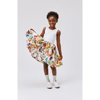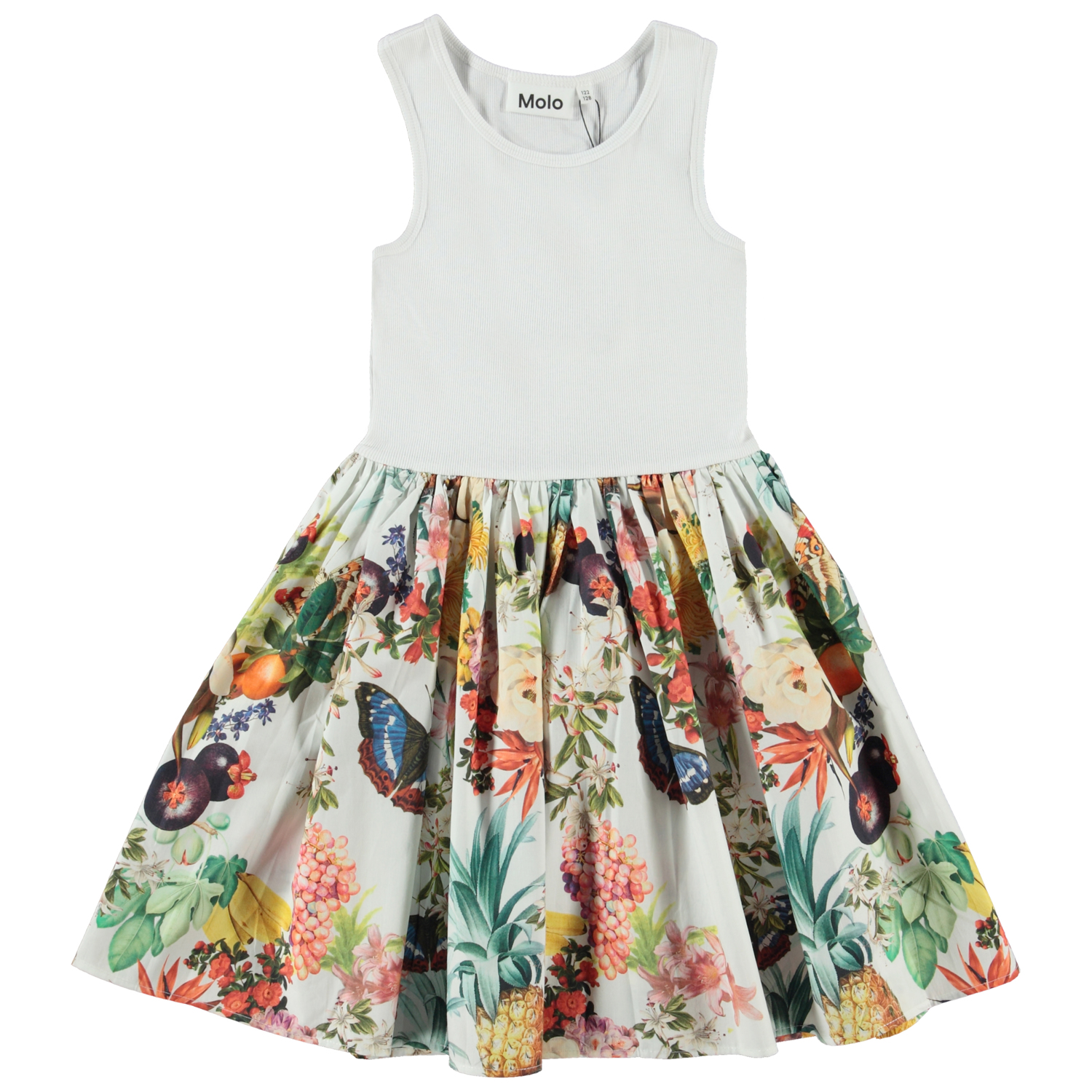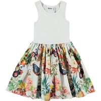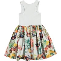 Cassandra är en vit klänning utan ärmar och rundad kjol i ekologisk bomull. Toppen är ibbad jersey och kjolen i bomullspoplin. Kjolen är med rankor av tropiska frukter, blommor och fjärilar.