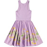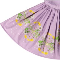Lila klänning i ekologisk bomull med en åtsittande ribbad jerseytopp och poplinskjol. Klänningen har en normal passform med ett mönster av maskrosväxter på kjolen.