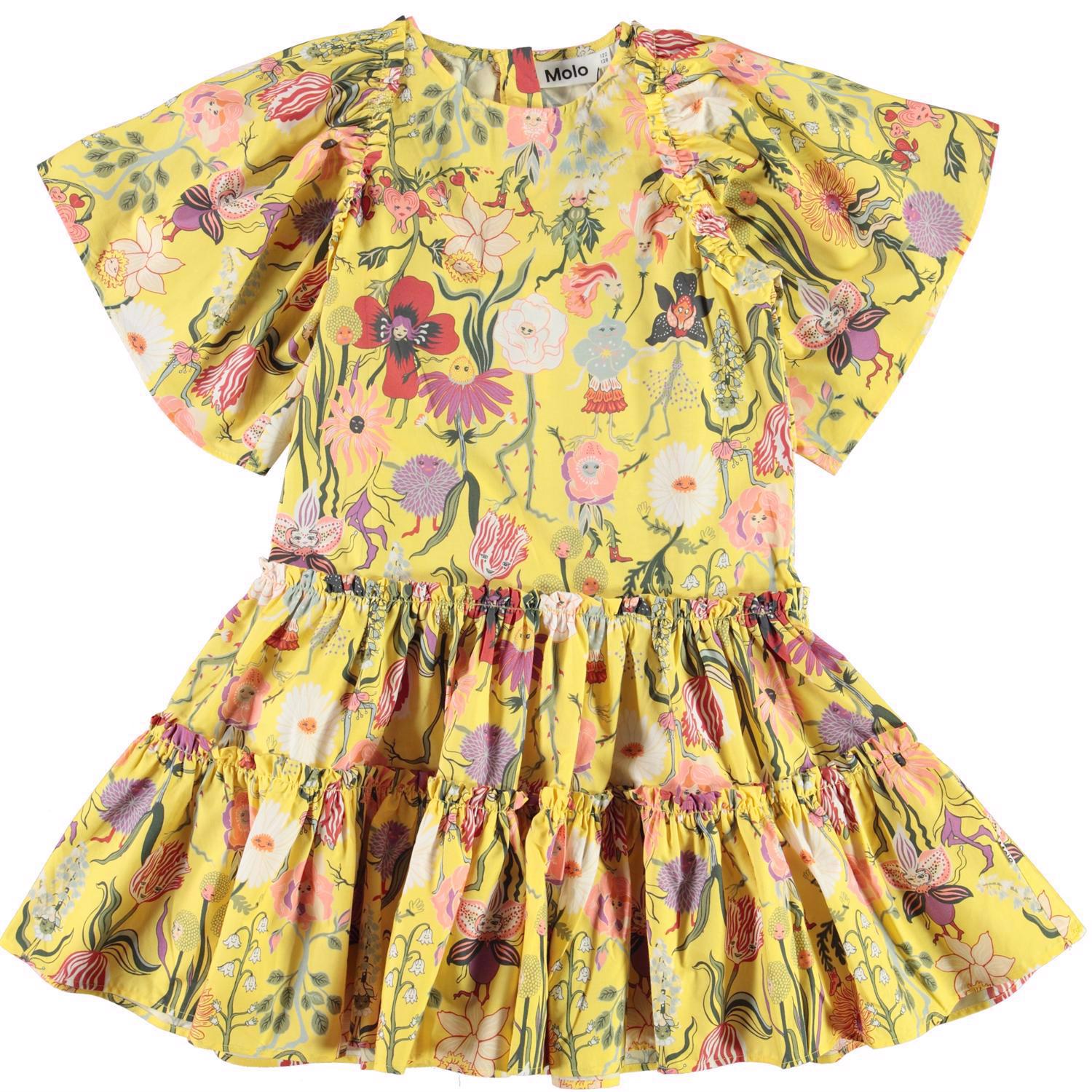 Cat är en klassisk poplinklänning i gul med dansande blommor. Klänningen har stora puffärmar, fin volym och stängs med dragkedja i nacken.