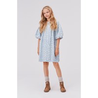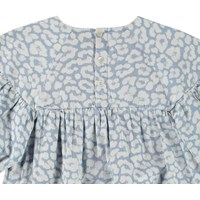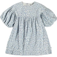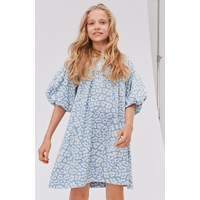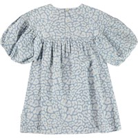 Catherine är en ljusblå klänning med leopardmönter. Klänningen har en fin volym och korta puffade ärmar, samt dragkedja bak i nacken.