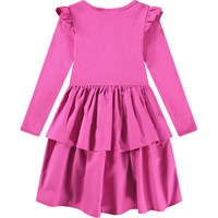 Långärmad rosa klänning i ekologisk bomull med en tight ribbad jerseytopp, rund hals, en liten volang på axlarna och en dubbel kjol i bomullspoplin som ger massor av veck och volym.