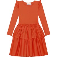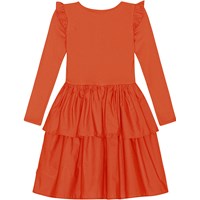 Långärmad röd klänning med rundad kjol i ekologisk bomull. Toppen är tight i ribbad jersey som gör den skön att ha på och enkel att ta av och på. Klänningen har rund hals, en liten volang vid axlarna och en kjol i bomullspoplin i två lager, med massor av rynkning och volym.