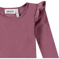 Långärmad lila klänning i ekologisk bomull med en åtsittande ribbad jerseytopp, rund hals, en liten volang på axlarna och en kjol i två lager bomullspoplin med gott om veck och volym.