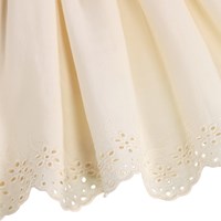 Off-white klänning i mjuk, ekologisk bomull med elegant broderi anglaise vid ärmarna och nederkanten. Klänningen har en rundskuren, voluminös kjol gjord av lätt bomullspoplin. Toppen har mjuka fjärilsärmar som faller snyggt över axlarna, samt en osynlig dragkedja bak för enkel på- och avklädning.