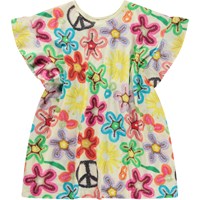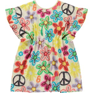 Lätt multifärgad tunika med volangärmar i 100% ekologisk bomull. Mönstret är virkade blommor i olika färger, som är sammansatta till ett roligt och somrigt mönster. Tunikan är enkel att röra sig i en dag på stranden med badkläderna under. Denna style har en oversized passform. Önskar man en mer normalpassform, rekomenderar viatt man väljer en storlek mindre än man brukar. Detta gäller också om barnet är mellan två storlekar.