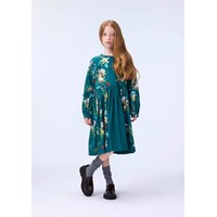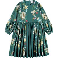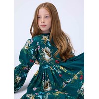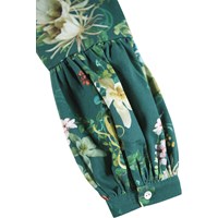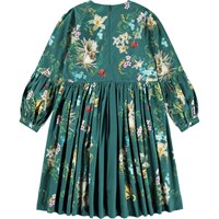 Lång grön klänning i ekologisk bomullstrikå med blommigt mönster. Klänningen har en rund halsringning, är något oversized med vackra rynkor i kjolen. De långa ärmarna har en fastsydd panel längst ner med rynkor, samt knäppning med knappar runt handleden för att ge volym åt ärmen. Klänningen är lätt att ta på med den osynliga dragkedjan på baksidan.