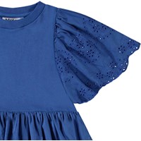 Blå knälång klänning i ekologisk bomull med en rund hals och ribbad nederkant. Klänningen har en åtsittande topp i bomullsjersey, fjärilsärmar och en kjol i två lager, med broderie anglaise på både kjolen och ärmarna.