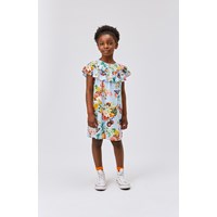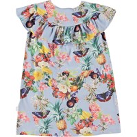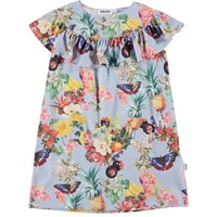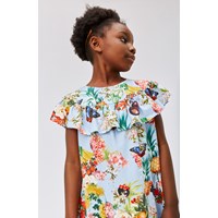 Celia är en kortärmad klänning i ekologisk bomullsjersey. Klänningen har en kant vid hals och axlar med påsydd volang somgår hela vägen runt och bildar klänningens ärmar. Celia är här med tropiska frukter, blommor och fjärilar över hela klänningen.