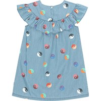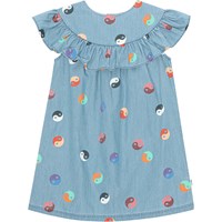 Kortärmad ljusblå klänning i mjuk bomull. Klänningen har en påsydd volang längs hela överdelen. Volangen bildar klänningens korta ärmar och den är enkel att ta på med knappar baktill. Klänningen har en ljusblå jeanslook med multifärgade yin och yang tecken.