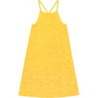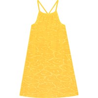 Klänning i gul bomullsfrotté. Klänningen har tunna axelband som korsar i ryggen och en lös passform. Den gula bomullsfrottén har smileys invävda i tyget. Bomullsfrottéär skönt att ha på och torkar snabbt efter bad.