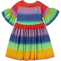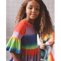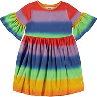 Här är klänningen Chasity med allover regnbågsmönster. Klänningen har voluminösa ärmar, som ger en fin siluett.