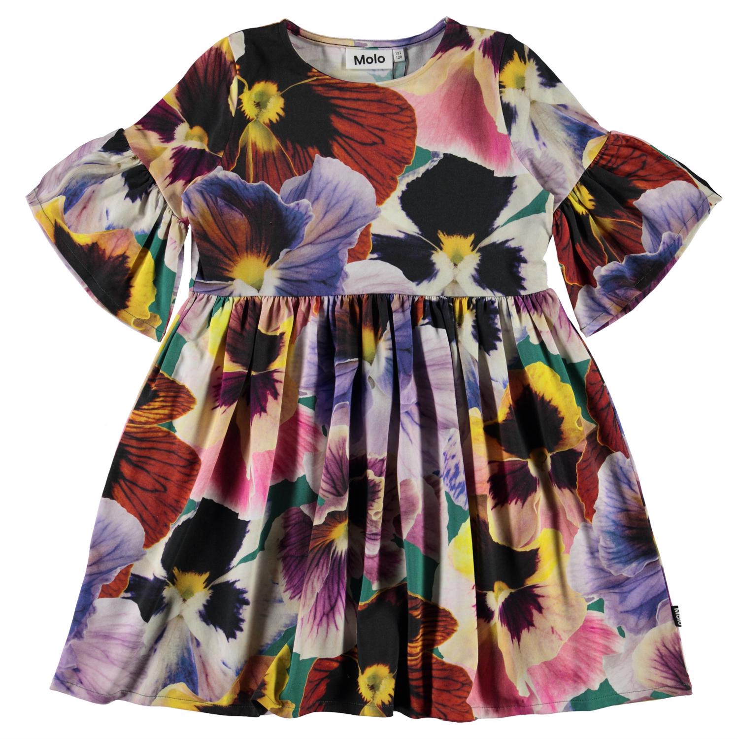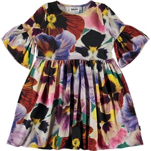 Chasity är en klänning med ett tryck av stora blommor. Klänningen har elastisk midja och puffärmar.