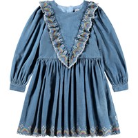 Långärmad denimklänning i mjuk, ekologisk bomull med fina broderie anglaise-detaljer. Klänningen har en lös passform, en volang framtill som bildar ett V och en midjesöm som ger lätt rynkning och fyllighet till den knälånga kjolen. Den stängs med en osynlig dragkedja på sidan och bak, vilket kombinerar vackra detaljer med hög komfort.