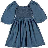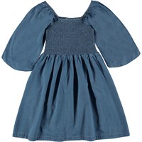 Blå midiklänning i bomullschambray. Denna klänning är tillverkad i 100% bomull, har fyrkantig halsringning, 3/4 längds ärmar med volym, topp med elastisk smock effekt och en normal passform.