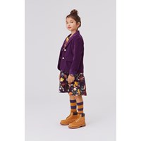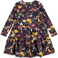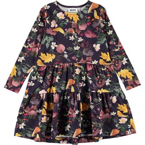 Chia är en mörklila klänning med bär, blommor och färgade blad. Klänningen har långa ärmar och en lös och skön passform.