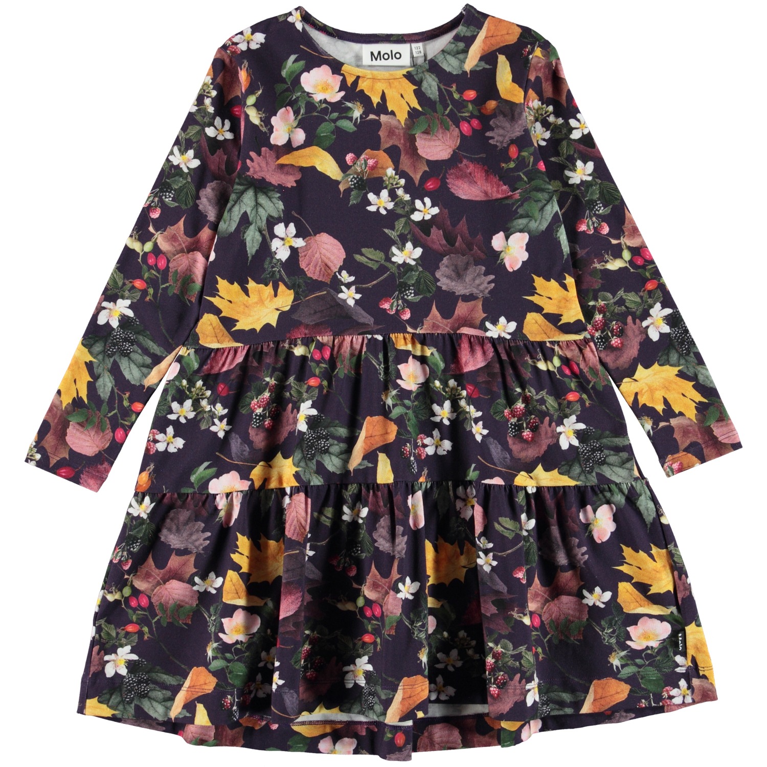 Chia är en mörklila klänning med bär, blommor och färgade blad. Klänningen har långa ärmar och en lös och skön passform.