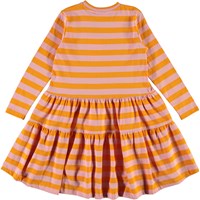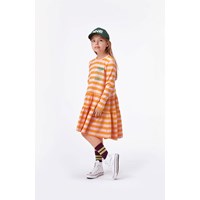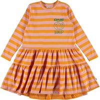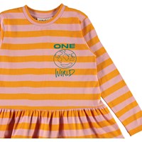 Chia är en orange och rosa randig klänning med 'One world' tryck på bröstet. Klänningen har långa ärmar och en lös och bekväm passform.