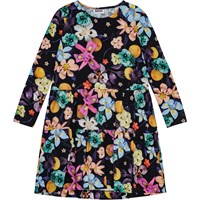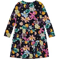 Svart jerseyklänning i ekologisk bomull med en lös passform, rund hals och långa åtsittande ärmar. Klänningen har en två-lagers kjol med gott om veck, vilket möjliggör lek och rörelse. Den har ett all-over tryck av livliga blommor i fräscha färger, som sticker ut vackert mot den svarta bakgrunden.