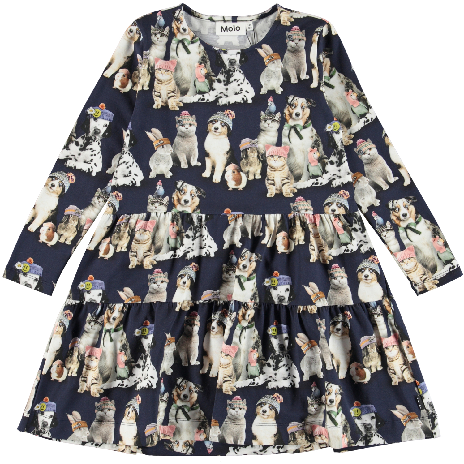 Chia är en mörkblå klänning med olika djur, som har mössor på. Klänningen har långa ärmar och en lös och skön passform.