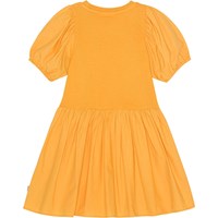 Knälång orange klänning i ekologisk bomull med en klöver vid bröstet. Toppen är i mjuk jersey med rund hals och korta voluminösa ärmar med gummiband. Kjolen rynkas vid höften och har en fin volym.