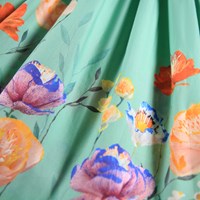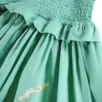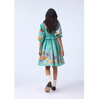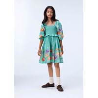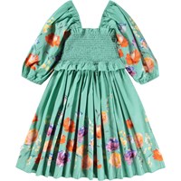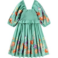 Grön klänning i ekologisk bomullspoplin. Klänningen har en fyrkantig urringning, 3/4-ärmar med volym och resår, en rynkad topp och en kjol med mycket volym. Ärmarna och kjolen är dekorerade med ett blommönster.
