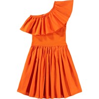 Röd klänning med en axel i mjuk ekologisk bomull med en åtsittande ribbad topp och en knälång, cirkulär lätt bomullspoplinkjol som ger volym och rörelse. Längs halsringningen löper en bred poplinvolang, vilket ger klänningen ett lekfullt och feminint uttryck.