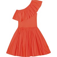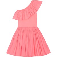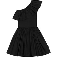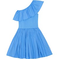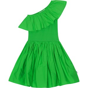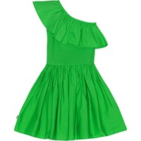 Grön enaxlad klänning i ekologisk bomull. Kjolen har en bred poplinvolang längs hela öppningen, en tight ribbad överdel, en voluminös underdel med knälång och rundad kjol.