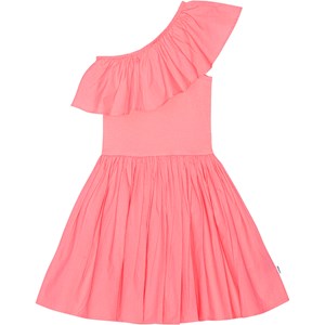 Korallfärgad enaxlad klänning i ekologisk bomull. Kjolen har en bred poplinvolang längs hela öppningen, en tight ribbad överdel, en voluminös underdel med knälång och rundad kjol.