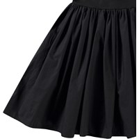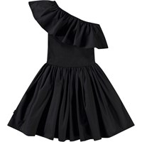 Svart enaxlad klänning i ekologisk bomull. Klänningen har en bred poplinvolang längs halsringningen, en åtsittande ribbad topp och en volyminös rundad kjol som går till knäna.
