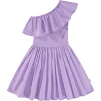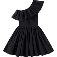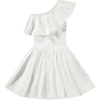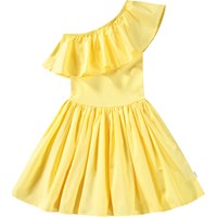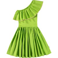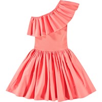 Korallfärgad enaxlad klänning i ekologisk bomull. Klänningen har en bred poplinvolang längs halsringningen, en åtsittande ribbad topp och en volyminös rundad kjol som går till knäna.