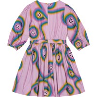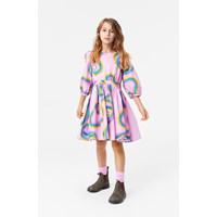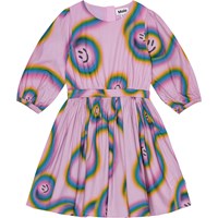 Rosa klänning i ekologisk bomull, knälång med en rund hals, trekvartsärmar med elastik vid handlederna och ett brett midjeband med elastik som ger rynkor. Klänningen är lätt att ta på sig med den osynliga dragkedjan som sitter på baksidan. Trycket på klänningen består av flytande regnbågar som bildar leende ansikten.