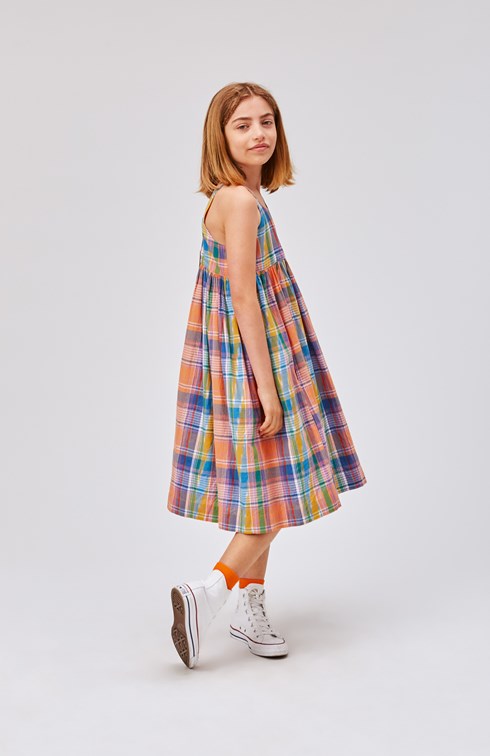 Chrissie är en lång klänning med multifärgade rutor i 100% bomull. Klänningen har ett empiresnitt, axelband och en skön och avslappnad fit. Kjolen är rynkad i midjan vilket ger fin volym.