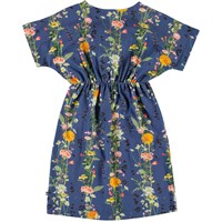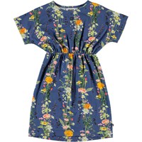Christa är en blå klänning med blommor. Klänningen har korta ärmar och rynkor i midjan, vilket ger klänningen en fin form.