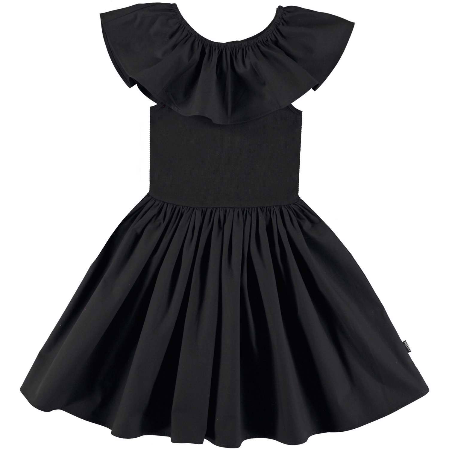 Christal är en svart klänning utan ärmar där överdelen är i ribb med stor volangkrage. Klänningens kjol är i poplin som har en fin volym.