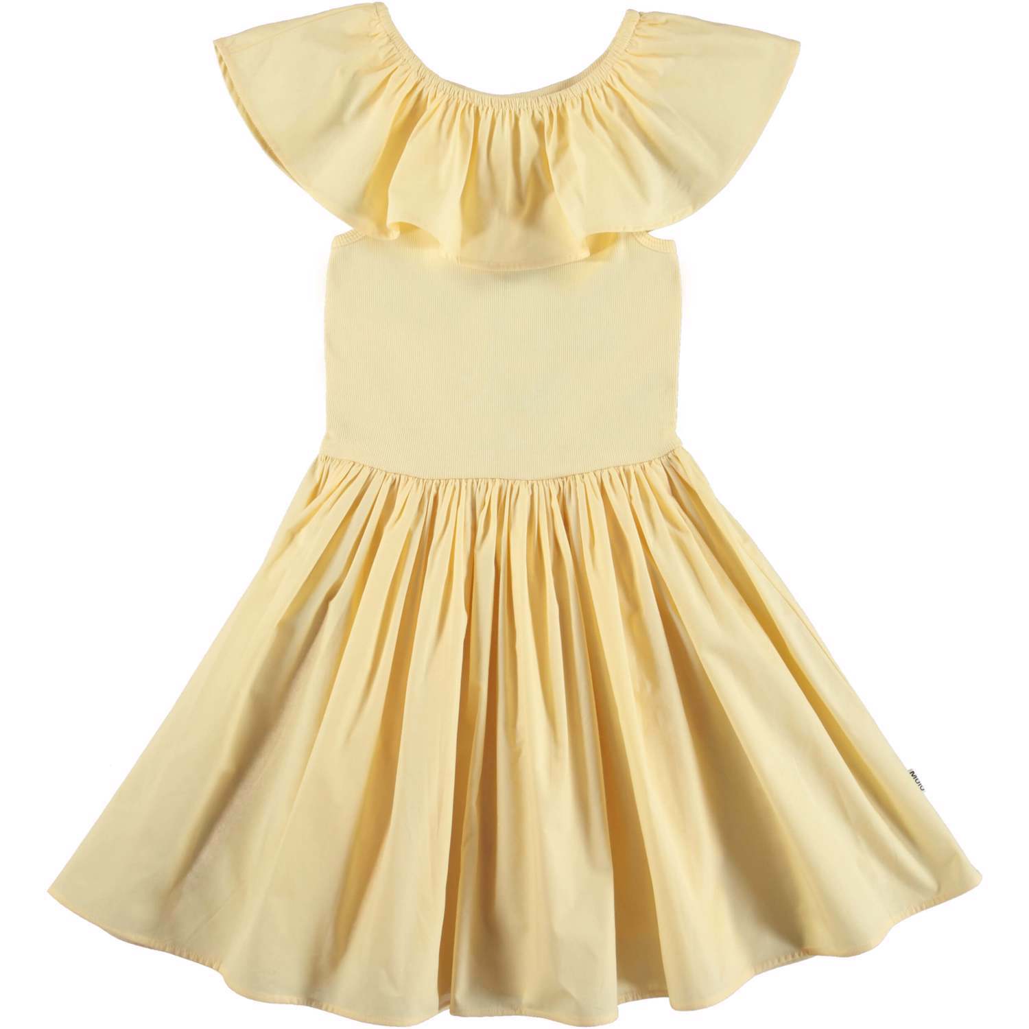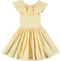 Christal är en ljusgul klänning utan ärmar där överdelen är i ribb med stor volangkrage. Klänningens kjol är i poplin som har en fin volym.