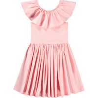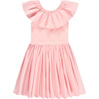 Rosa klänning i mjuk, ekologisk bomull med en åtsittande ribbad jerseytopp och rund halsringning. Klänningen har en voluminös, cirkelskuren kjol gjord av lätt bomullspoplin, vilket skapar en vacker kontrast till den enkla toppen. Toppen är ärmlös och har en stor volangkrage som kan bäras både på axlarna eller av axlarna.