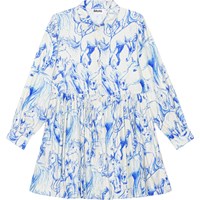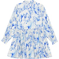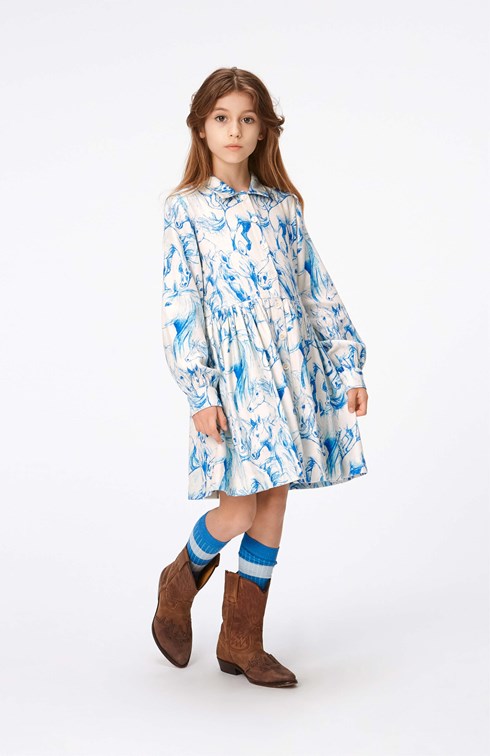 Råvit knälång klänning med blått hästmönster. Klänningen har långa ärmar med knappar, en klassisk krage och pärlemorsknappar framtill. Klänningen är skuren på mitten som ger en runkeffekt till kjolen.