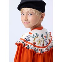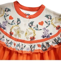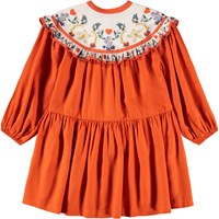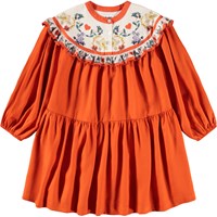 Orange knälång klänning i viskos. Klänningen har en rund halsringning, en fin knappstängning framtill, resår kring handlederna och en fastsydd kjol i cirkelskärning. Livstycket är dekorerat med ett blommigt mönster och en delikat volangkant.