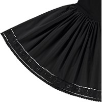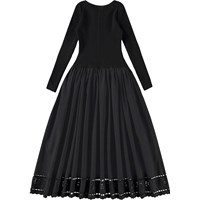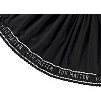 Långärmad svart klänning i ekologisk bomull med en åtsittande ribbad jerseytopp, rund halsringning och en volyminös rundad kjol i bomullspoplin. Kjolen har en broderad kant med texten 'You Matter'.
