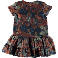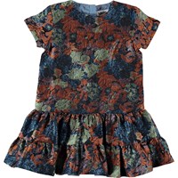 Cicely är en festlig jaquard klänning i snygga vinter färger med lite glitter i. Cicely har tvådelad volang, korta ärmar och dragkedja i nacken.