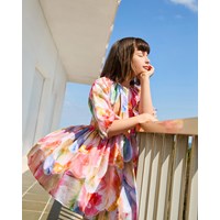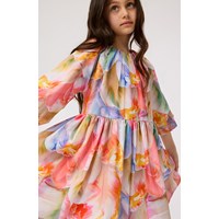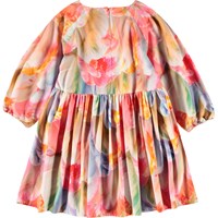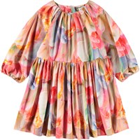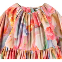 Mönstrad blommig klänning i ekologisk bomull med veck runt halsringningen. Klänningen har en oversize passform med ärmar i tre fjärdedels längd med resår och en osynlig dragkedja i ryggen.
