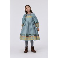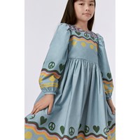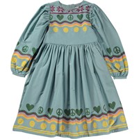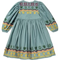 Blå knälång klänning med en grafisk version av de klassiska nordiska stickade traditionerna, med Molo´s egna symboler. Denna klänning är tillverkad i 100% bomull, har rund hals, hög midja, låna ärmar, kjol med massor av volym, dold dragkedja i ryggen och en lös passform.