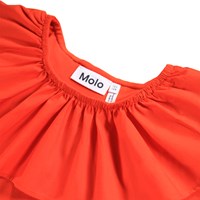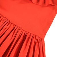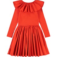 Röd knälång klänning i ekologisk bomull med en åtsittande jerseytop och en voluminös kjol i bomullspoplin. Klänningen har långa ärmar och en stor poplinkrage som kan bäras off-shoulder.