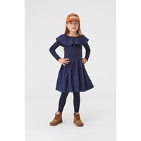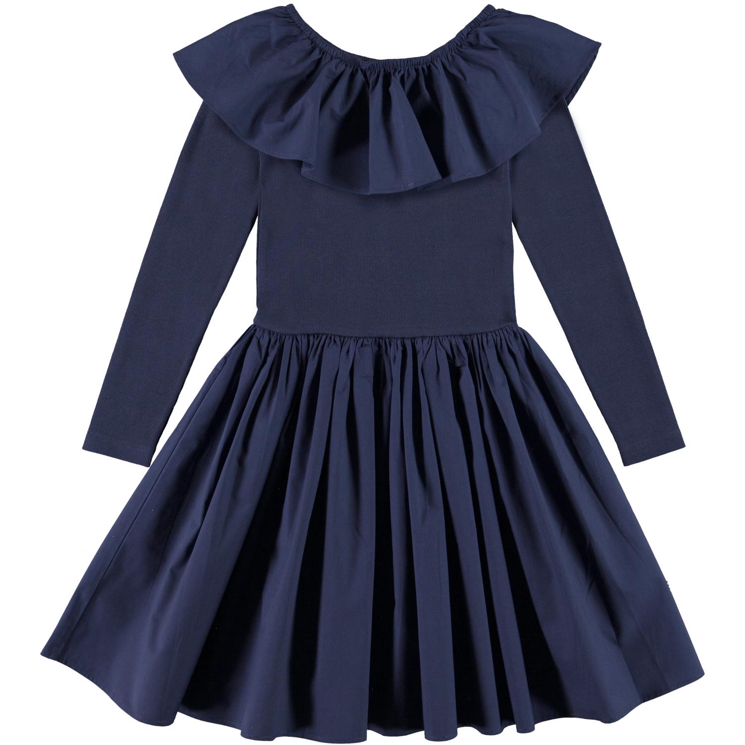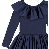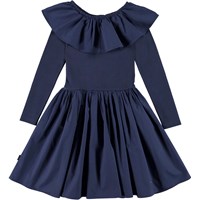 Cille är en 'One of a kind' klänning, som både är väldigt bekväm att ha på sig och ser helt fantastisk ut. Klänningen är mörkblå och långärmad med en topp som är ribbad, samt en peplumkjol och en stor krage med mycket volym.