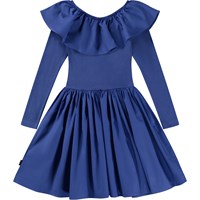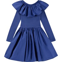 Klarblå knälång klänning med långa ärmar, poplinkrage och kjol. Poplinkragen är med gummiband och kan bäras både off-shoulder och uppe på axlarna, då fungerar den både som krage och en fin ärmdetalj. Denna klänning är tillverkad i 100% bomull i kropp och ärmar, och 100% bomullspoplin i krage och kjol och har en smal passform.