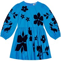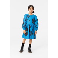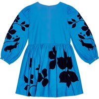 Knälång turkos bomullsklänning med djup rygg, rund hals, långa ärmar med knappar, samt en midjesöm. Klänningen har en generöst samlad kjol, vilket ger den volym. Den är lätt att ta på sig med den osynliga dragkedjan som sitter i sidsömmen under armen. Klänningen har ett tryck av svarta kaniner och konstnärliga blommor, vackert placerade på ärmen och kjolen.