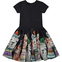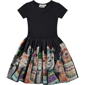Svart knälång kortärmad klänning med poplinkjol med lamor. Här ser du söta och roliga lamor med massor av humor. De har fått på sig Molo´s egna stickade plagg och är ordentligt påklädda i mössor, halsdukar och tröjor. Denna klänning är tillverkad i 100% bomull, har rund hals, korta ärmar, poplinkjol med mycket volym och en smal passform.