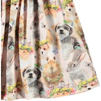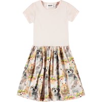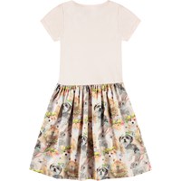 Rosa kortärmad klänning i ekologisk bomull med en åtsittande ribbad jerseytop och slät jerseykjol. Klänningen har en normal passform med ett sött mönster av bedårande djur med blomsterkransar på huvudet.