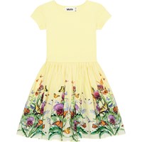 Svart kortärmad klänning med rundad kjol i ekologisk bomull. Toppen är i ribbad jersey och tight, medan kjolen är i bomullsjesrey med ett mönster av bilar med eldlågor i nattens mörker.