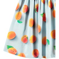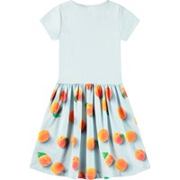 Ljusblå kortärmad klänning i ekologisk bomull med en åtsittande ribbad jerseytopp och slät jerseykjol. Klänningen har en normal passform med ett mönster av mogna aprikoser.